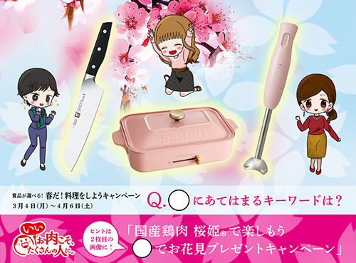 日本ハム株式会社(本社:大阪市北区、社長:畑 佳秀)は、「国産鶏肉 桜姫で楽しもう 桜でお花見プレゼントキャンペーン」を実施します。本キャンペーンは期間ごとに実施するエリアが分かれており、3月3日(日)から4月6日(土)までの期間を九州から関東エリア限定(※)にて、4月7日(日)から5月11日(土)までの期間を東北から北海道エリア限定にて実施します。日本を縦断する桜の開花時期に合わせ、2つのエリアに分けて実施します。当選人数は「お花見」「桜」の単語にかけ、九州から関東エリアは「873(ハナミ)」名様に、東北から北海道エリアは「396(サクラ)」名様に設定しました。
