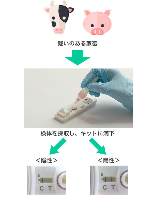 2019年度より本キットを製造・販売しており、同年9月に改定された「口蹄疫に関する特定家畜伝染病防疫指針」にて、家畜防疫員が異常家畜の発生した現場にて本キットを使用できる旨が記載されました。これにより、日本各地の家畜保健衛生所や動物検疫所などに供給され、口蹄疫の発生に備えていただいています。