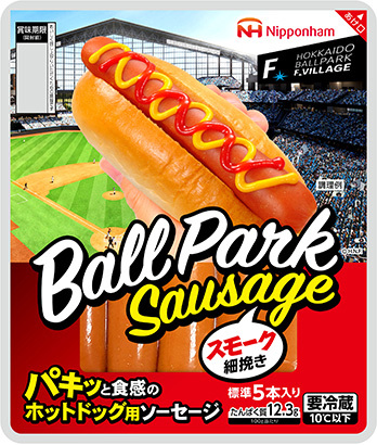 本商品は、パンにはさむだけで片手で簡単に食べることができるホットドック用のソーセージで、パッケージデザインには2023年に開業する「北海道ボールパークFビレッジ」 のロゴマークと球場イメージを使用しています。