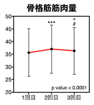 食事+運動介入後(2回目)、介入前(1回目)と比べ、骨格筋筋肉量が増加した。一方、食事 + 運動の介入後に運動のみ介入した場合(3回目)、骨格筋筋肉量の有意な減少がみられた。