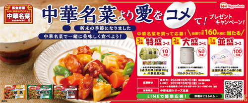 日本ハム株式会社(本社:大阪市北区、社長:畑佳秀)は、野菜等を加えるだけで中華料理ができる「中華名菜®」シリーズ新商品を8月20日に発売いたします。さらに「中華名菜より愛をコメて!プレゼントキャンペーン」を8月18日~9月30日に実施。豪華賞品が160名様に当たるほか、同時開催のフォトコンテストにおいてオリジナルクオ・カードが100名様に当たります。