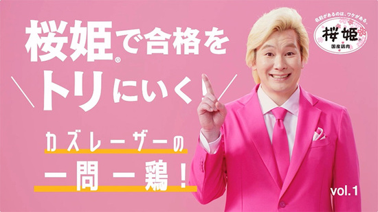 今回のWebムービー第1弾は、「桜姫」のイメージカラー“桜色”のスーツを着たカズレーザーさんが、受験生や受験生を支える家族の皆さんからのお悩みに一問一“鶏(答)”形式で答える内容となっています。お悩みに対して、カズレーザーさんらしい独特の視点で解答いただきました。