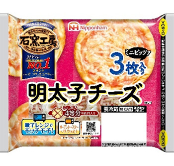 | 特長 | ・昼食やおやつにピッタリなミニピザです。 ・電子レンジでもちもち、オーブントースターでサクッとした食感がお楽しみいただけます。 ・風味豊かな明太子ソースを使用しています。 ・手で切れる4等分切れ目入り。 |