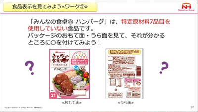 食物アレルギーに関するクイズや、実際に商品を手にしながら表示を見てもらうワークを実施しました。また、食物アレルギー配慮商品に取り組む企業として、普段は見ることのできない製造の様子などを紹介しながら、少しでも食物アレルギーに興味を持って楽しく学べる内容にしました。授業中、児童からは「卵や乳を使わずにハムやウインナーを作ることで大変なことはありますか?」「食物アレルギー対応食品は何歳ぐらいの人をターゲットにしていますか?」等、たくさんの質問をいただきました。また、授業後には「これからは食物アレルギーの原因になる食品が入っていないかしっかり確認したい」「食物アレルギーの人でも食べられるレシピをもっと調べたいと思った」「弟は卵アレルギーがあるのでパッケージ表示を見たり、卵が含まれている場合には別のものにしたりと工夫したい」等の感想をいただき、食物アレルギーへの関心や知識が深まった様子がうかがえました。