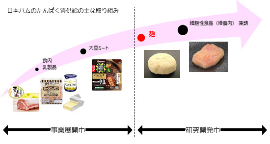 日本ハム株式会社(本社:大阪市北区、代表取締役社長:井川 伸久)は、「5つのマテリアリティ」の「たんぱく質の安定調達・供給」につながる取り組みの一つとして、細胞性食品(培養肉)、藻類に加えて、「第三のたんぱく質」として“麹”に着目した研究開発を推進します。たんぱく質豊富な“麹”そのものを食材とした新たな商品開発を行い、2024年のテスト販売を目指します。