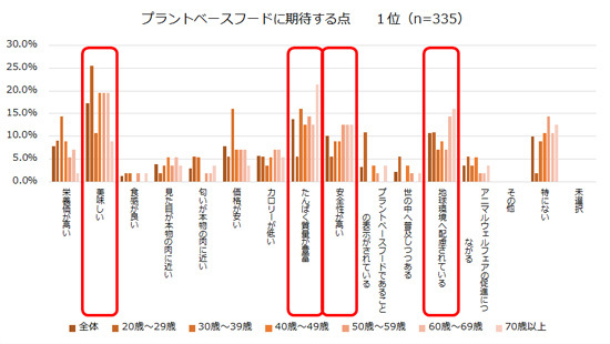 ※プラントベースフードに期待する点の1位は、「美味しい」「たんぱく質量が豊富」「安全性が高い」「地球環境へ配慮されている」の回答割合が高い。