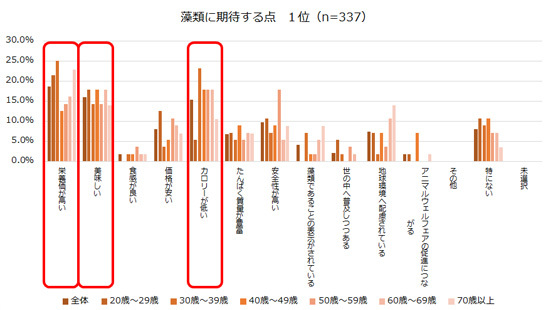 ※藻類に期待する点の1位は、「栄養価が高い」「美味しい」「カロリーが低い」の回答割合が高い。