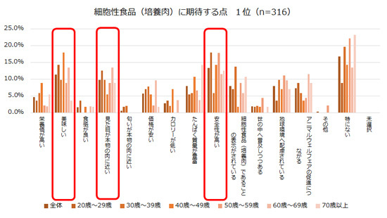 ※細胞性食品(培養肉)に期待する点の1位は、「安全性が高い」「美味しい」「見た目が本物の肉に近い」の回答割合が高い。