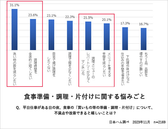 当社が行った調査によると、仕事がある日の夜は、洗い物を減らしたいと思っている人が約3人に1人と高いのに次いで、調理時間を減らしたいと考える人も約4人に1人と多いことから、調理から洗い物までをいかに簡単に済ませるかが重要になっています。また、メニューを考える手間やマンネリ化に対する悩みも抱えていることが分かります。