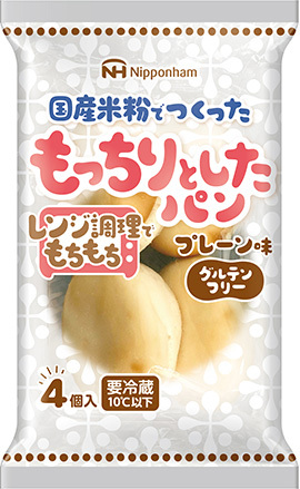 | 特長 | ・冷蔵保存、電子レンジ調理でもちもちの食感をお楽しみいただけます。 ・国産米粉を使用した米粉パンです。 ・グルテンフリー食品です。 ・食物アレルギー対応商品です。 |
