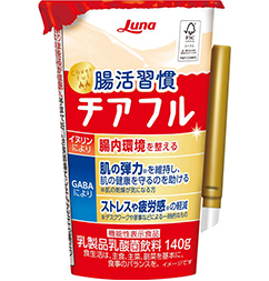 『腸活習慣 チアフル』は、程良い甘さと酸味ですっきりとした飲みやすさが特長の乳製品乳酸菌飲料です。本商品には、イヌリン(食物繊維)とGABAの2つの機能性関与成分が含まれ、「腸内環境を整える※1」「肌の弾力の維持※2」「ストレスや疲労感の軽減※3」の3つの機能で機能性表示を取得しています。美容や健康を意識している、忙しい日々を送っている方におすすめです。