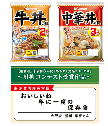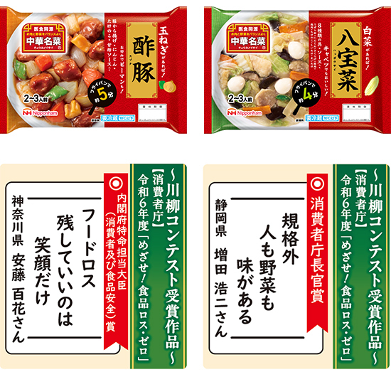 日本ハム株式会社(本社:大阪市北区、代表取締役社長:井川 伸久)は、食品ロス削減の普及啓発に貢献するため、消費者庁の食品ロス削減に向けた取り組みの一つである令和6年度「めざせ!食品ロス・ゼロ」川柳コンテストの受賞作品の一部を「中華名菜酢豚」などの商品パッケージに10月より順次掲載します。また、当社の各ブランドのSNSアカウントから食品ロス削減に向けた情報発信を行います。10月の食品ロス削減月間に向けて、本取り組みを通して、広く食品ロス削減における意識向上を図るとともに、今後も社会課題の解決に取り組んでいきます。
