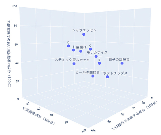 (食にまつわる音と今回調査したウインナー各製品の音を比較した3Dマップ)