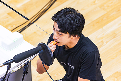 2025年シーズンに、北海道日本ハムファイターズの選手がバットでボールを捉えた瞬間の音と比較分析した結果です。例えば、2025年7月6日の打球音は、チーム内でも一番と言えるほどのスイングスピードをもつパワー型バッターによるホームランでした。高い周波数まで音が伸び、響く時間が長く縦線状にくっきりと分布が表れているのは、力強く芯でしっかりとらえている証拠です。この打球音をシャウエッセンの音に差し替えたところ、違和感がないほど類似性がありました。
