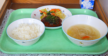 特定原材料8品目不使用のビーフンをスープに、お好みソースをハンバーグに使用した給食。ドレッシングもサラダ用に提供。先生からは「思った以上に児童が興味を持ってくれた」という感想とともに、「開発に携わっている方々からの説明を受け、製品に触れることで、子供たちも食物アレルギーを身近に感じることができたと思う」と食品メーカーならではの取り組みについて評価くださいました。当日の給食には、プロジェクトA参画企業の食物アレルギー配慮商品であるビーフンやお好みソースが使用され、サラダ用にはドレッシングも用意。担当された栄養士の先生は、今回の出前授業をきっかけに知った食物アレルギー配慮商品もあったことや、「食物アレルギーがある場合、給食では該当の食材を除去して提供するが、児童には自分で気付けるようになってほしい」と、成長への期待をお話しされていました。