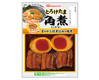 豚三枚肉を三回に分けてじっくり煮込み、柔らかく仕上げた角煮と煮卵風(卵黄加工品)を入れました。