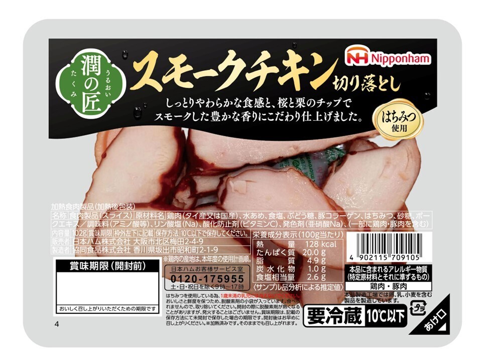 潤の匠スモークチキン切り落とししっとりやわらかな食感と、桜と栗のチップでスモークした豊かな香りにこだわり仕上げました。