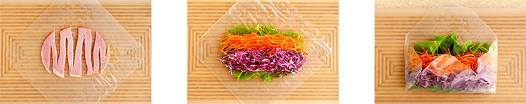 紫キャベツとにんじんは千切りにし、アボカドは縦に4等分にする。ロースハムは8mm幅で左右から交互に切り込みを入れる。