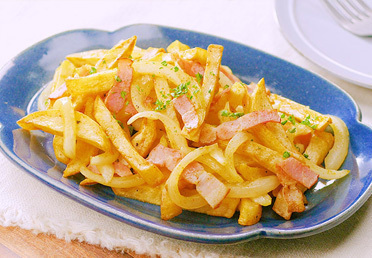 玉ねぎは5mm厚さに切る。エリンギは4cm長さに切り、縦4等分にする。ベーコンは2cm幅に切る。にんじんは5mm厚さの輪切りにしてハート型に抜く。ブロッコリーは小房に分ける。にんじん、ブロッコリーはやわらかくなるまでゆでる。