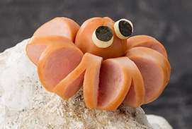 1本めのウインナーの両側に竹串を置き5mm間隔に切り込みを入れる。更に45度ウインナーを回し切り込みの間を切る(ジャバラ切り)ウインナーの両端を持ち丸める