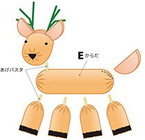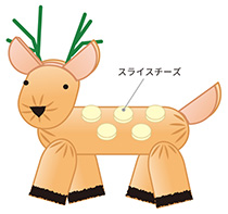 しっぽの位置にタテに切り込みを入れ、C(しっぽ)を差し込みます。チーズをストローで切り抜き、E(からだ)にシカの模様をつけて出来上がりです。