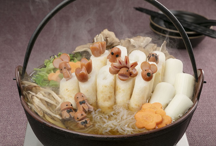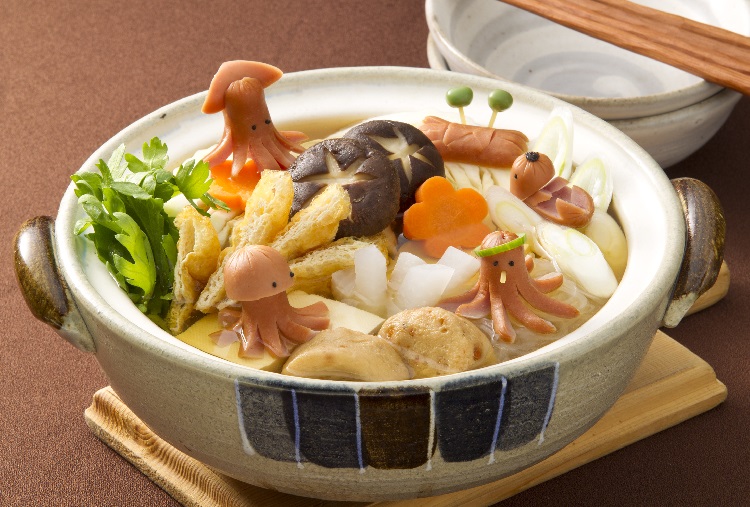 きりたんぽの先に飾り切りの動物達やチューリップを差し込んで煮込んで下さい。