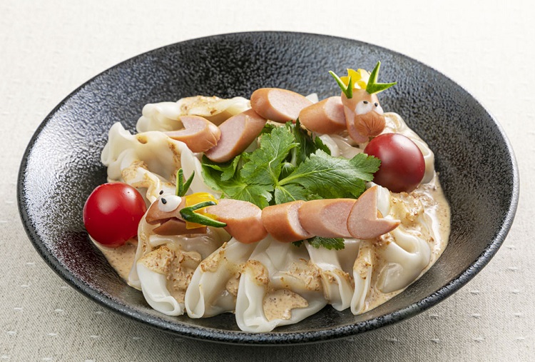鶏がらスープで野菜を煮て火が通ったら水餃子と飾り切りのイカ、うなぎ、龍を入れ、ひと煮立ちしたら出来上がり。ぽん酢やお好みのタレでお召し上がり下さい。