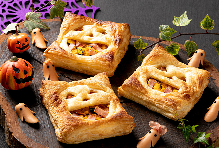 サクサクのパイとクリーミーなかぼちゃクリームが美味しい定番のパイです。ウイニーのおばけたちも集まってきました。