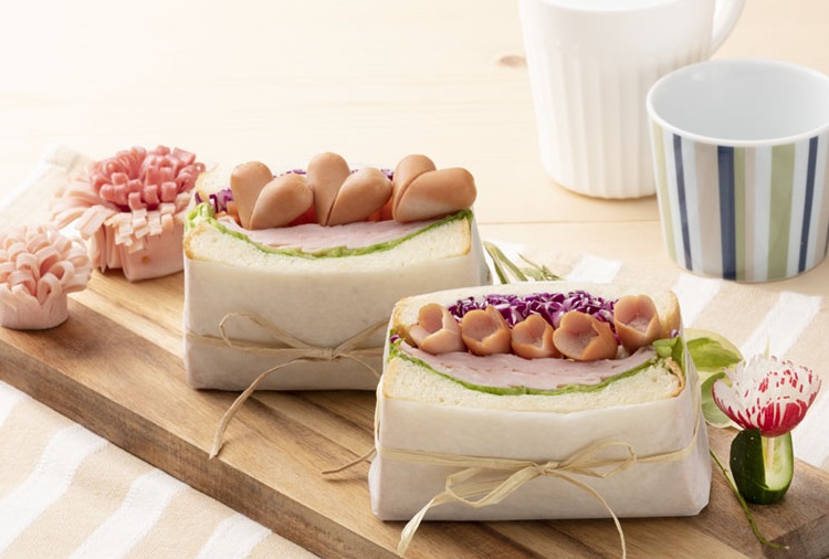 飾り切りハム(タンポポ、菊)チキンナゲット、ミートボールクマさんをバケットにはさんで、朝から元気に!