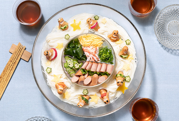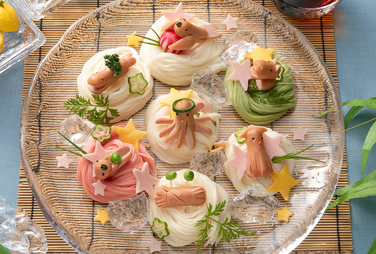 だんだんと暑くなってくるこの時期。水辺の仲間たちをトッピングしたそうめんに子供たちも大喜び。