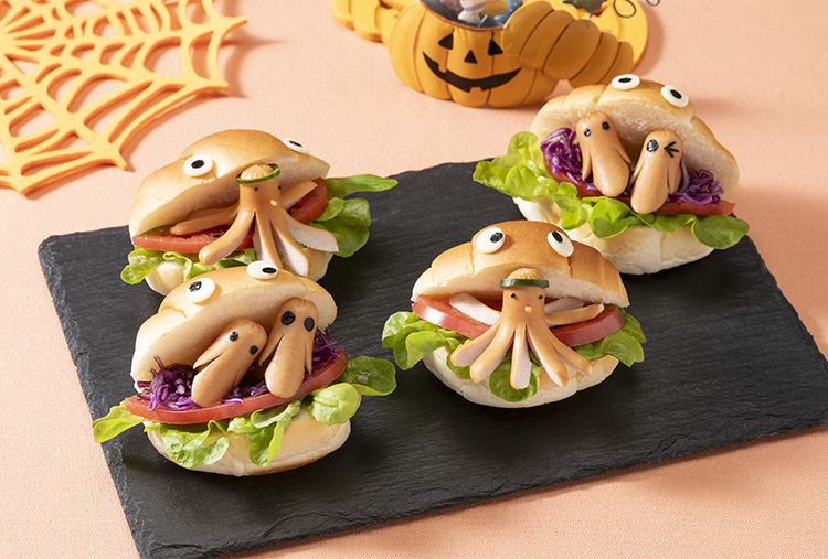 ロールパンに飾り切りのゴーストやタコさんを挟み込んだ楽しいハロウィンメニューです。