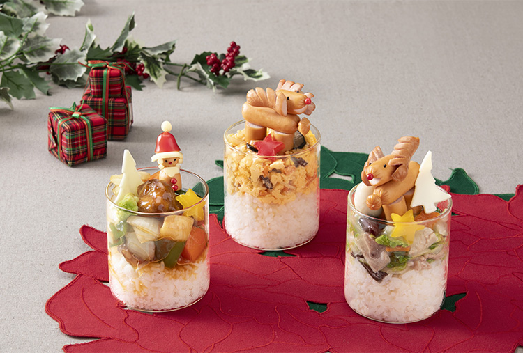 サンタグラスには酢豚、まん中のトナカイグラスはかに玉、右のグラスには八宝菜を使っています。