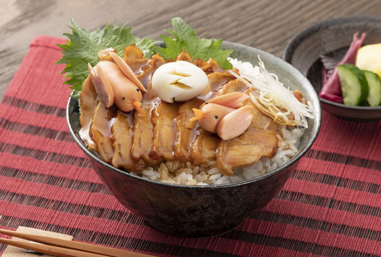 トリの仲間を飾って、賑やかなどんぶりにしましょう。