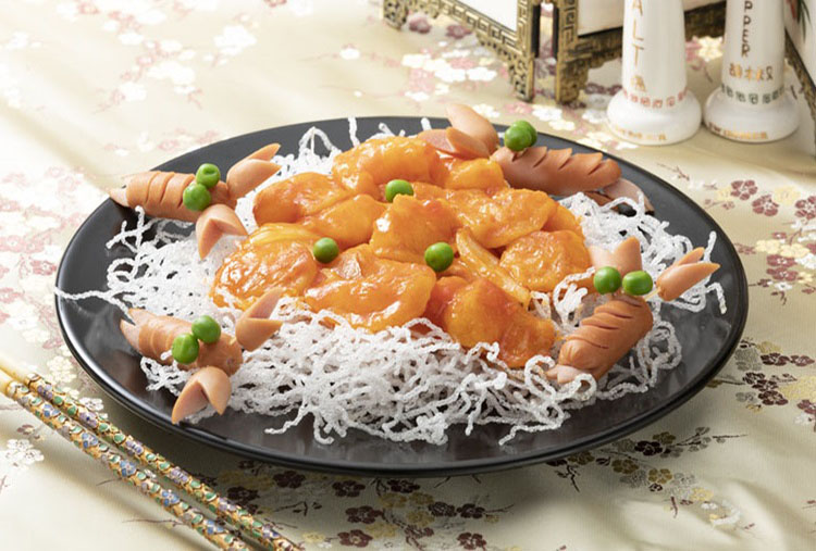 八宝菜の上に、固焼きそばをのせ飾り切りの小鳥、ひよこを、トッピング。