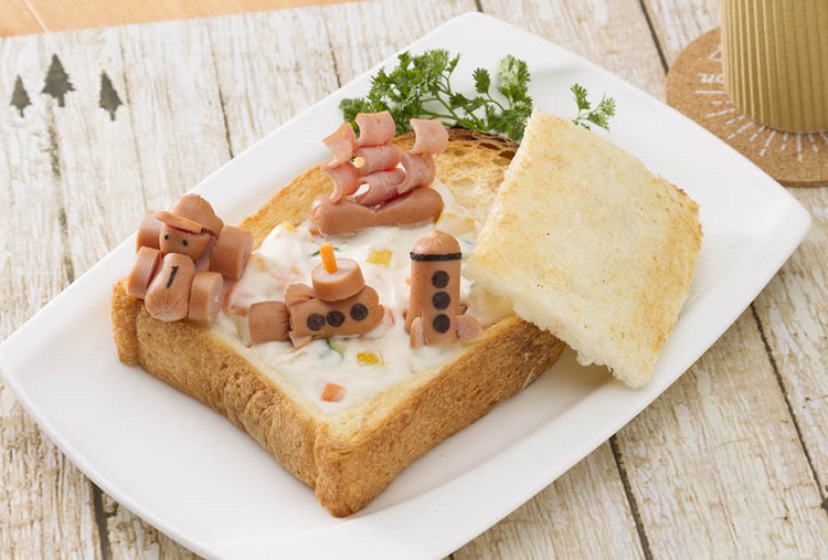 バゲットを1cmの厚さにスライスしてタマゴサラダをのせ、乗り物の飾り切りをトッピングして出来上がり。
