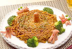 いつもの焼きそばに飾り切りを盛り付けるだけで、楽しさ満点。