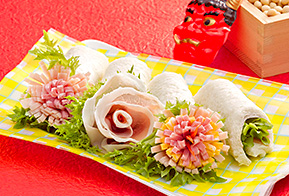 作りやすくて食べやすいミニ恵方巻です。ウイニーを5本巻いてお花の形に出来上がり、子供さんにも喜ばれます。