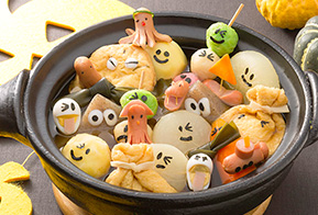 おでんの具材に、海苔で切り抜いた目や口をつけます。ご家庭でのハロウィンパーティーが盛り上がるのは間違いなし♪
