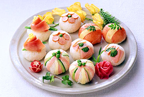 酢めしの上に、キュウリ、錦糸卵、デンブの3色で春をイメージ。ハムの飾り切りタンポポ、菊をのせる。