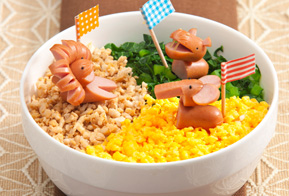 オムライスには輪切りにしたウインナーを入れグリンピースを持った動物達をトッピングしよう。