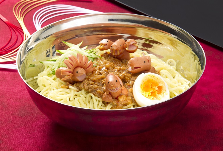 飾り切りした辰は、お雑煮の具材の上に配置します。辰の目はチーズと黒ごま、角はきゅうりで作りました。