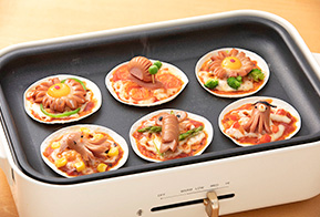 餃子の皮にピザ用ソースをぬり、お好みでピーマン、コーンや茹でたアスパラ、ブロッコリーをのせ、とろけるチーズをのせ、飾り切りをトッピング!ホットプレートで5~6分中火で加熱して出来上がり!