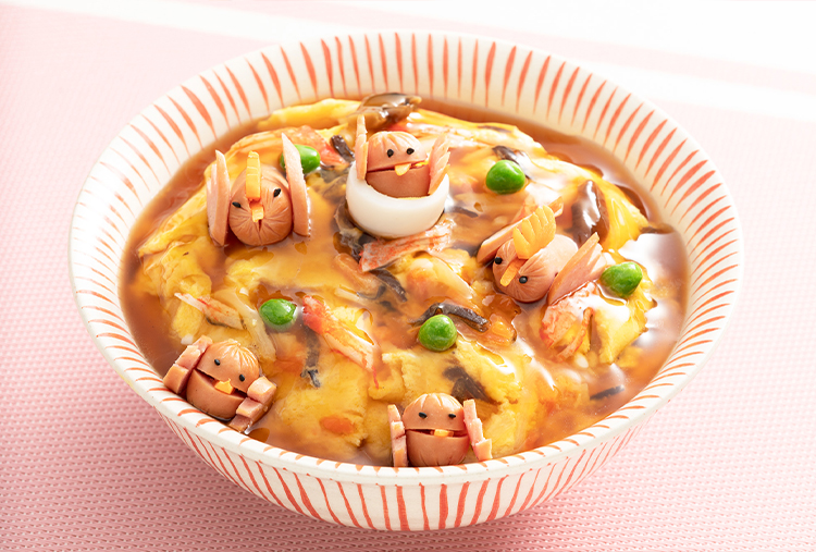 にんじんの短冊切りカニカマを手でほぐし、甘酢のタレで加熱し卵をとぎ入れ、半熟状になるまで加熱します。グリンピースと飾り切りのヒヨコをのせ出来上がり!