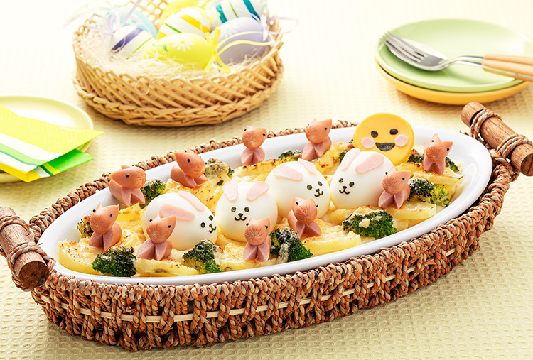 イースターのグラタンは、卵とウインナーのうさぎたちで大賑わい。