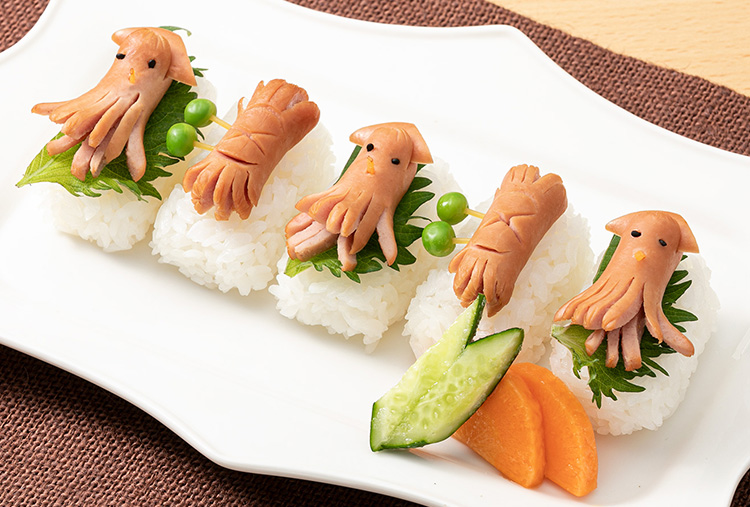 飾り切りのタコ、イカ、ウナギは1分ボイルしてから塩おにぎりに、のりでとめて下さい。
