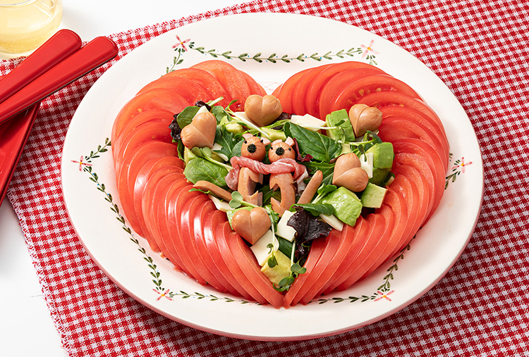 バレンタインデーのサラダ。ラブラブな飾り切りのりすの周りはトマトのハートが彩ります。