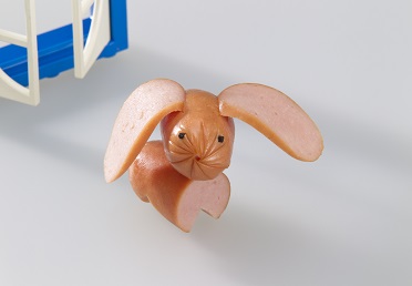 2のうす切り2枚を3の切り込みに入れると耳の出来上がり。AとBをパスタで留める。