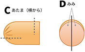 C(あたま)の頭頂部にみみを挟むための5mm程の切込みを入れ、口になる部分に1cmの切り込みを入れます。