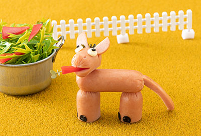 3本目のウインナーの中央部分にV字の切り込みを入れ、E(胴体)、F(しっぽ)を切り出します。