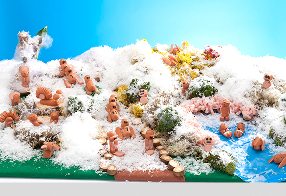 ゴボウの木に登るコアラとカンガルーの親子で家族の団らんを表現しました。